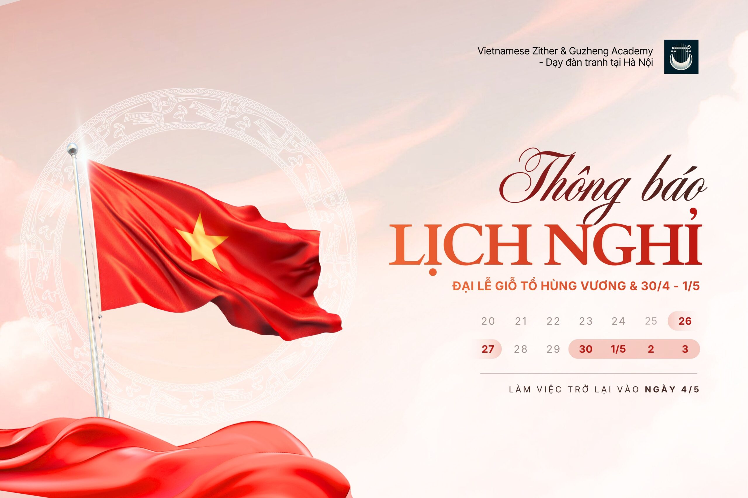 Vietnamese Zither & Guzheng Academy xin trân trọng thông báo đến Quý phụ huynh và học viên lịch nghỉ lễ nhân dịp Giỗ Tổ Hùng Vương và kỳ nghỉ 30/4 – 1/5 sắp tới.